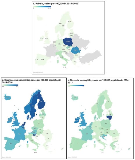 Figure 1. Long-term selected vaccine-preventable childhood diseases incidence rates in the EU and EFTA countries: (a) measles (2015–2019), (b) mumps (2014–2018), (c) rubella (2014–2019), (d) Streptococcus pneumoniae (2014–2018), (e) Neisseria meningitidis (2014–2017).- Measles, mumps (no data for Belgium 2019), polio, chicken pox, and rotavirus diarrhea. Depending on the disease, the data for different years were available: 2015–2019 for measles, 2014–2018 for mumps, 2014–2019 for rubella, 2014–2018 for Streptococcus pneumoniae, and 2014–2017 for Neisseria meningitidis. For each disease and country, the infection cases from the available years were summed up and then presented as the number of cases in the period per 100,000 population.