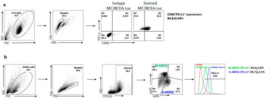 Isolated L-MDSC and tumor cells were stained with antibodies specific for murine CD11b, Ly6C, Ly6G, PD-L1, and human CD66 to assess MDSC and tumor phenotypic expression of PD-L1. Unstained cells and isotype controls were used for setting laser voltages. Results were analyzed with FlowJo 10.6.1 (Tree Star Inc., Ashland, OR, USA) and gating performed using isotype controls.