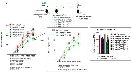 We previously reported that L-MDSC inhibits CAR-T-dependent tumor cytotoxicity in vitro, which gets reversed by targeting STAT3 that induces apoptosis in L-MDSC [31,32]. To investigate whether a similar effect in TME is observed with anti-PD-1 treatment, we challenged mice with intra-splenic MC38-CEA-luc to generate LM followed by treatment on day 3 with varying concentrations (0.3–5 mg/kg) of anti-PD-1 treatment delivered via TV or PV as shown in Figure 2a. Our in vivo results revealed improved response at 3 mg/kg on PTD7 via PV as compared to 3 mg/kg via TV (p = 0.04) and compared to vehicle control (p = 0.001) (Figure 2a). Significant differences were seen in TB for all escalating doses delivered via PV compared to vehicle control and only in 5 mg/kg TV compared to vehicle control (PTD7 p < 0.05). The minimal effective dose at PTD7 was 5 mg/kg (p = 0.01) via TV and 0.3 mg/kg (p = 0.02) via PV compared to vehicle control indicating a lower dose requirement via RD to achieve similar anti-tumor activity as observed with SD. No significant difference between delivery routes, PV or TV, was observed for any time point for any of the lower doses (0.3 mg/kg, 1 mg/kg).