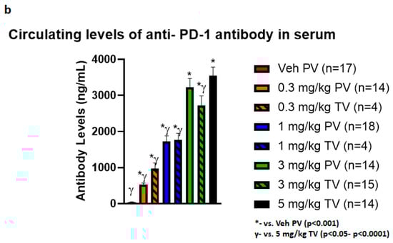 Using an ELISA assay, the serum of treated mice was assessed for levels of circulating anti-PD-1 antibody and all doses were detectable compared to the vehicle control cohort (p < 0.001 for all comparisons, Figure 2b). This study revealed that serum levels of the anti-PD-1 agent increased in a dose-dependent fashion, regardless of route of delivery. When comparing similar doses, there were no significant differences found between 3 mg/kg PV vs. 3 mg/kg TV (3233.10 vs. 2714.09 ng/mL, p = 0.17). However, the lower RD doses at 0.3 mg/kg PV and 1 mg/kg PV both resulted in significantly less detected antibody in circulation compared to all higher doses regardless of route of delivery (0.3 mg/kg PV, p < 0.001 for all comparisons, 1.0 mg/kg PV, p < 0.01–p < 0.001). There was a 6.7-fold reduction in comparing 0.3 mg/kg PV to the minimum efficacious systemic dose of 5 mg/kg TV (p < 0.001). Additionally, the 3 mg/kg TV cohort revealed lower amounts of antibody than 5 mg/kg TV (p = 0.03), indicating an increase in circulating anti-PD-1 antibody does not necessarily correlate to improved response (Figure 2a).