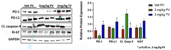 To evaluate the apoptosis/proliferation of tumor cells due to PD-1 inhibition, LM tumor lysates from PTD3 were isolated from three mice that received 3 mg/kg via either TV or PV, and vehicle control groups, respectively. These groups were selected to allow a direct comparison between delivery routes using the same doses. Western blot analysis showed significantly low PD-1 protein expression in 3 mg/kg PV as compared to vehicle control (p < 0.05) which confirmed increased inhibition of PD-1 in PV as compared to TV or vehicle control with no change in PD-L1 expression in the tumors (Figure 4). Interestingly, the level of cleaved caspase 9 in 3 mg/kg PV was induced, suggesting increased apoptosis as compared to vehicle control and 3 mg/kg TV groups (p < 0.05). There was also a decreasing trend, though not significant in Ki67 expression in 3 mg/kg PV as compared to 3 mg/kg TV and vehicle control. Raw data of western blots that were used for Figure 4 with quantification for individual bands for each protein is available in Supplementary Figure S1.
