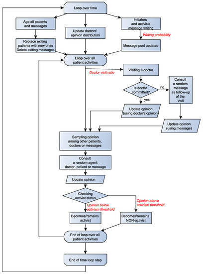 The flow of the simulation consists of four main processes (the flowchart for the simulations is shown in Figure 1). The first is the life-cycle of patients and messages: their aging and exiting the system when a certain age is reached. In the case of patients, to keep their number constant, each time a patient reaches the maximum age, it is replaced by a new agent, with the initial opinion drawn from the same truncated normal distribution as that used for the original set. When a message reaches the maximum age (set at 90 simulation steps), it is not automatically replaced, which means that the number of ‘active’ messages may vary with time.