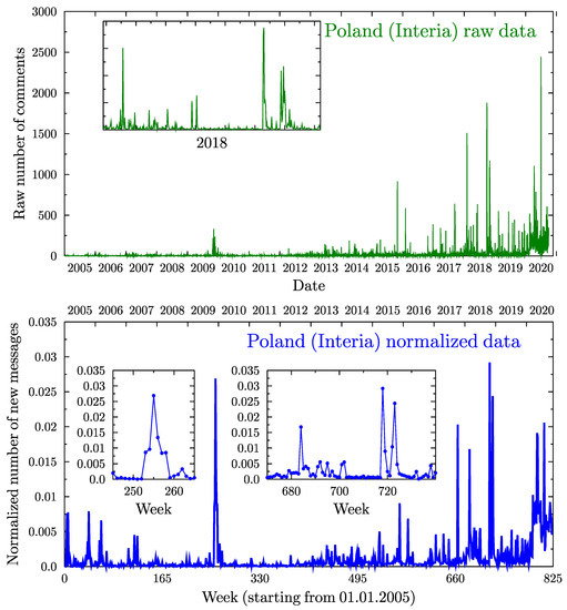 Figure 2 presents Interia comment activity identified as vaccine related (via the keyword search). The upper panel presents the absolute daily number of such comments (‘raw data’). The gradual growth of this number, observed in both the height of peaks of activity and the low activity background, may be traced to the increased popularity of the Web site as a whole. The general traffic at Interia has been steadily increasing since 2005. The average weekly number of all comments in the first half of 2005 was approximately 2500, which grew to over 20,000 by 2012 and to over 170,000 by 2020. The traffic increase happened in a relatively smooth manner, which allowed us to normalize the number of vaccination related messages by dividing by the smoothed total number of comments at a given time. Such re-scaling allows us to focus on the relative interest in vaccination related topics. The normalization enhances the role of the observed peaks in activity prior to 2012, and the results are presented in the lower panel of Figure 2 (normalized numbers). The step-like increase since early 2020 (week numbers greater than 800) is related to the COVID-19 pandemic.
