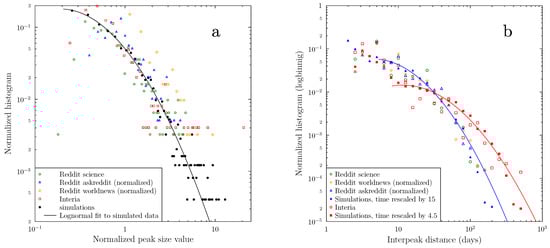 (a) histogram distribution of relative new messages peak heights for the empirical datasets and for the simulations (averaged over 20 simulation runs). The line shows a lognormal fit to the simulation data; (b) histogram of the distribution of distances between peaks in the same datasets as shown in panel a. Filled symbols show the inter-peak distance distribution in the simulations with simulation time rescaled by 4.5 and by 15 (to fit the data from Interia and Reddit, respectively). The lines show lognormal fits to the simulated data.