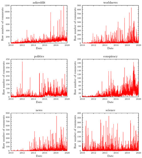 The Reddit comments are publicly available as a fh-bigquery dataset, which contains a reddit_comments database (https://bigquery.cloud.google.com/dataset/fh-bigquery:reddit_comments (accessed on 16 July 2021)). This database is divided into tables for a year (for years up to 2010) or year-month (for later years) period and each table contains all comments from Reddit for a given interval of time. Each comment contains at least the following fields—username, subreddit_id, comment id, comment text, and timestamp. Data can be accessed using the Google BigQuery console and queried using standard SQL commands. Access to this dataset is free for the first terabyte each month, with the rest priced according to Google Cloud pricing.