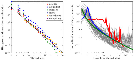 User activity within threads typically decreases rather quickly, falling within 5–10 days to the level of increasingly separated single posts, which may sometimes ‘revive’ the thread long after its origin. The decrease in user activity within threads identified using the keyword search shows weak long-tail behavior and may be approximated by the log-Cauchy distribution. We have identified very few exceptions to this rule (see the discussion in the right-hand panel of Figure 5). Our observations are thus in agreement with [78,84], who showed that the distribution of activity in a subreddit (measured by the time between an original post and the time of the last response) is heavy-tailed, with some posts being active after more than a hundred days. Moreover, Ref. [32] gives examples of subreddits with different authorship characteristics (dominated by original posts, dominated by comments and mixing posts and comments in comparable numbers)—aspects that we also observe.
