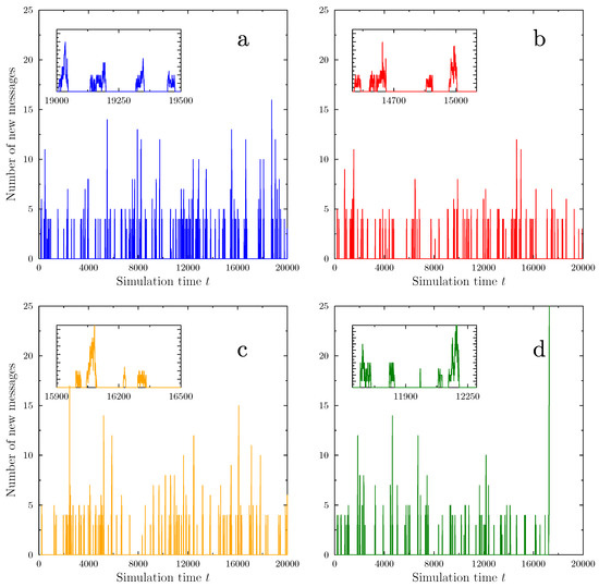 The third group, very small in number, is called ‘initiators’. These are special agents whose opinions are unchanged, and whose ‘task’ is to create the initial stream of persuasive messages. The model assumes that the number of initiators is very small, which is in full agreement with recent studies of AV activity covering Facebook and Instagram [69,70].