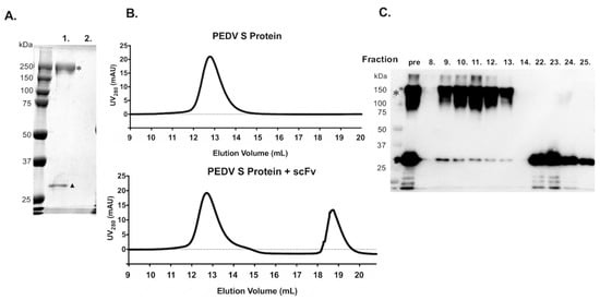 3.4. Binding Ability of scFv with Purified PEDV S Protein by Using Pull-Down Assay and SEC