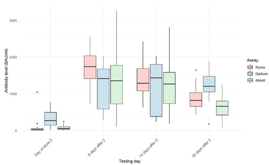 Following the second vaccine dose, all participants had their SARS-CoV-2 antibody levels measured on days 8, 14, and 30 after the second dose. Only samples from the participants whose results remained within the Roche assay detection limit were included in further comparisons of the results obtained on days 8 (n = 31), 14 (n = 31), and 30 (n = 31). Supplementary Materials Figures S4–S6 show Passing–Bablok and Bland–Altman plots for those three time points.