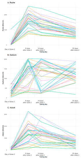 The dynamics of changes in the antibody levels in tested samples measured with Roche, DiaSorin, and Abbott tests are shown in Figure 1. All three tests show a large significant increase in the mean value of the antibody levels from the day of the second dose of the vaccine to day 8 after the second dose. However, differences between results obtained on day 8 and day 14, and day 14 and day 30 were statistically significant for both comparisons only for the Roche assay (day 8–14: 1665.2 BAU/mL–1349.2 BAU/mL, p < 0.0001; and day 14–30: 1349.2 BAU/mL–854.1 BAU/mL, p < 0.0001). Mean values of the DiaSorin results in both cases were not statistically significant (day 8–14: 1248.0 BAU/mL–1196.4 BAU/mL, p = 0.72; and day 14–30: 1196.4 BAU/mL–1221.0 BAU/mL, p = 0.85). In the case of the Abbott test, the difference between day 8 and day 14 was not statistically significant (day 8–14: 1409.5 BAU/mL–1276.5 BAU/mL, p = 0.09), while the comparison of day 14 with day 30 showed a significant difference (day 14–30: 1276.5 BAU/mL–631.6 BAU/mL, p < 0.0001).
