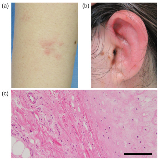 The patient’s right forearm (a) and left ear (b). (c) Pathological findings for the auricular cartilage. Hematoxylin and eosin (H&E) staining, original magnification 200×. Scale bar, 20 μm.