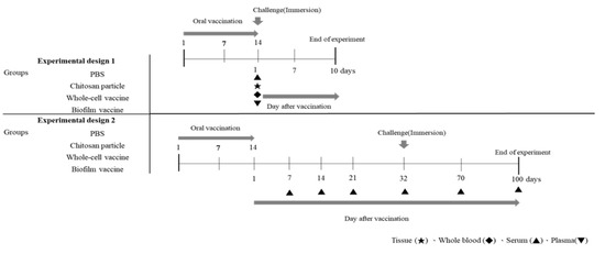 The time course of vaccination and sampling are shown in Figure 1. After one month of acclimation in FRP tanks, the fish were divided into four groups and moved to 80 L FRP tanks, each containing 23 fish. Four groups were established: the biofilm vaccine group, whole-cell group, the chitosan particle group and the PBS group. Each were vaccinated for 14 consecutive days. The collected samples were analysed for immune-related genes. The collected blood was analysed to measure phagocytic ability, albumin–globulin ratio and antibodies after vaccination. The vaccinated fish in each group were challenged with L. garvieae at 1 day post-vaccination (Figure 1). Finally, the survival rate was calculated.
