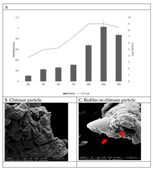 Biofilms were grown on chitosan particle surfaces and were quantitated at different time points. The results show that bacteria attached to the chitosan and began to form a biofilm at 3 h, reaching a peak at 48 h (Figure 2A,C). Since the correlation between biofilm DMMB and CFU was R = 0.97 at 48 h (data not shown), in this study we quantified the biofilm by CFU. Figure 2B shows chitosan particles without L. garvieae bacteria.