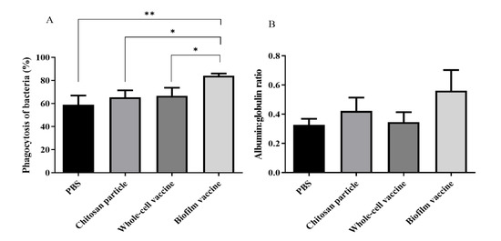Phagocytic capacity and A/G ratio are important parameters of the innate immune response. Our results show that mullet fish are able to mount an immune response against L. garvieae bacteria after vaccination. The phagocytic ability in the biofilm group was 84%, and the A/G ratio was 0.56, which values are higher than those in the other groups. However, the phagocytic ability in the whole-cell group was 66% and the A/G ratio was 0.34, which values are not significantly higher than those in the other groups. In addition, the chitosan particle group had a phagocytic ability of 65% and an A/G ratio of 0.42. The same findings were reported in a previous study by Ranjan et al., who found that feeding chitosan increased the phagocytic capacity and A/G ratio of seabass [42]. Therefore, we hypothesise that chitosan particles might also act as an adjuvant for biofilm vaccines to enhance the innate immunity of mullet fish.