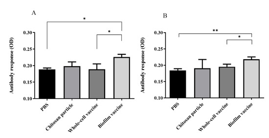 In order to evaluate the antibody response against biofilm and whole-cell bacteria after vaccination, 107 (CFU/well) whole cells or biofilms were coated in 96-well plates with serum and used to measure IgM titres. The anti-L. garvieae biofilm IgM titre in the biofilm vaccine group was significantly higher than those in PBS and whole-cell groups (p < 0.05) (Figure 5A). The OD450 value of the biofilm vaccine group was 0.22, and those of the chitosan particle, whole-cell vaccine and PBS groups were respectively 0.19, 0.18 and 0.18. In addition, the anti-L. garvieae whole-cell IgM titre in the biofilm vaccine group was significantly higher than those in the PBS and whole-cell groups (p < 0.05) (Figure 5B). The OD450 value in the biofilm vaccine group was 0.218, and those in the chitosan particle, whole-cell vaccine and PBS groups were 0.19, 0.195 and 0.184.