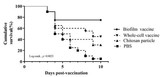 Black mullets were orally administered different vaccines daily for 14 days and then challenged with 107 CFU/mL L. garvieae. The death of fish was observed, starting at 3 days after the challenge and increasing gradually. Nine days after the L. garvieae challenge, the survival rates for the groups administered feed with the biofilm vaccine, whole-cell vaccine, chitosan particles and PBS were respectively 75%, 45%, 30% and 5% (Figure 7), and the differences were significant. The relative percent survival (RPS) was 74%, 42% and 26% for the biofilm vaccine, whole-cell vaccine and chitosan particle groups, respectively (Table 2).