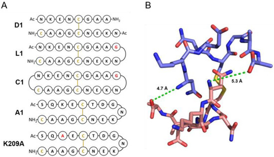 (A) Schematic representation of dimeric 4D11 epitope peptides: dimer—D1, linear—L1, backbone cyclised—C1, wild-type sequence 17-residue peptide—A1 and its single point mutant—K209A, which has had the residue Lys209, which is important for 9H4 binding, replaced with alanine. (B) Crystal structure of 4D11-bound homodimer peptide (PDB ID: 5TBD) shows close proximity between the N- and C-termini of the peptides; green dashed lines indicate distance between the peptide termini.