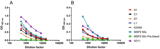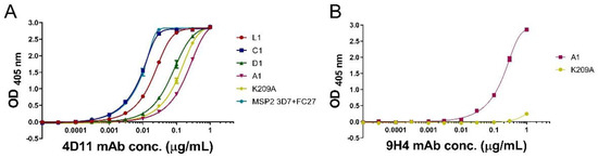 ELISA was used to assess whether mAbs 4D11 and 9H4 could still recognise the KLH-conjugated peptides using a mixture of full-length 3D7 and FC27 MSP2 as a positive control antigen (Figure 3A). 4D11 mAb was able to bind all peptide conjugates, with C1-KLH the tightest binder, having an EC50 of 0.009 µg/mL, followed by L1-KLH and D1-KLH with EC50 of 0.02 and 0.07 µg/mL, respectively. The A1-KLH and K209A-KLH conjugates had weaker binding (EC50 of 0.21 and 0.12 µg/mL, respectively) when compared to other peptide conjugates. This suggests that the dimeric peptides may be stabilised in a conformation that is more favourable for mAb binding. Additionally, the close proximity of the C-terminal cysteine conjugation to the 4D11 epitope in A1-KLH and K209A-KLH may hinder binding of 4D11 to these two conjugates. 9H4 mAb bound the A1-KLH conjugate but not the K209A-KLH conjugate, confirming that the mutation of residue Lys209 to Ala had successfully inhibited recognition by this mAb (Figure 3B).