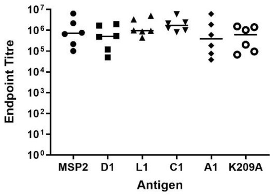 - McCarthy, J.S.; Marjason, J.; Elliott, S.; Fahey, P.; Bang, G.; Malkin, E.; Tierney, E.; Aked-Hurditch, H.; Adda, C.; Cross, N.; et al. A Phase 1 trial of MSP2-C1, a blood-stage malaria vaccine containing 2 isoforms of MSP2 formulated with Montanide® ISA 720. PLoS ONE 2011, 6, e24413. [Google Scholar] [CrossRef]