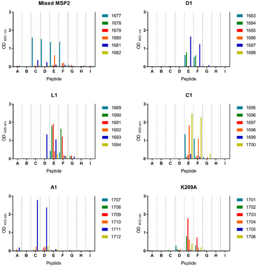 To characterise the response against these dimeric peptides further, the specificity of the induced antibodies was determined by indirect ELISA using an array of nine biotinylated peptides that spanned the epitopes recognised by the 4D11 and 9H4 mAbs (peptides A-I) (Table 3). Peptides C and D spanned the 9H4 epitope, whilst peptides E to G spanned the 4D11 epitope. The 3D7 + FC27 MSP2 mixture elicited a response towards peptides C-F, encompassing both the 9H4 and 4D11 epitopes (Figure 5). However, the response against MSP2 was largely dominated by a single mouse in the group. In contrast, responses against each of the dimeric peptide-KLH conjugates (D1, C1, and L1) were more consistent across the groups, and were almost exclusively directed to the 4D11 epitope. Only one instance of cross reactivity was observed, with one mouse in the L1 cohort generating antibodies that recognised peptide D. The lack of binding to the adjacent peptide C suggests that these antibodies recognised residues closer to the peptide C-terminus, probably the GNKENC residues that are present in the immunising peptide.