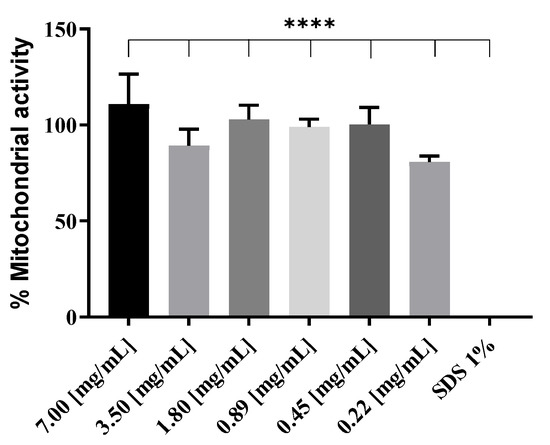 Effect on mitochondrial activity of different concentrations of blank DOTAP 4 liposomes on RAW 264.7 cells after 4 h incubation. Data were normalized to non-treated cell results; SDS served as positive control. Data are presented as mean ± SD (n = 3). **** indicate p < 0.0001 when comparing SDS 1% group with other groups.