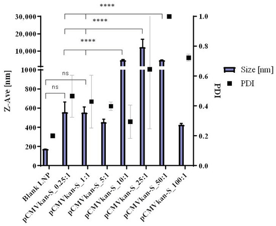 DLS results for DOTAP4/pCMVkan-S complexes at different N/P ratios, Z-Ave [nm], and PDI are plotted and jointly analyzed in this graph. Results are compared to blank liposome size profile. Lipoplex data were measured 30 min after liposome-DNA complexation at various N/P ratios. Data are presented as mean ± SD. **** indicates p < 0.0001, ns = p > 0.05, not statistically significant when compared to other groups.