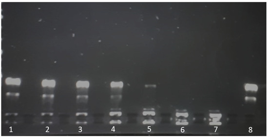 1% Agarose gel electrophoresis of pCMVkan-S in PBS: DOTAP4/pCMVkan-S N/P ratio 0.25:1 (1), 1:1 (2), 5:1 (3), 10:1 (4), 25:1 (5), 50:1 (6), 100:1 (7), and naked pCMVkan-S (8). Migration was performed in TBE buffer at 80 V for 30 min.