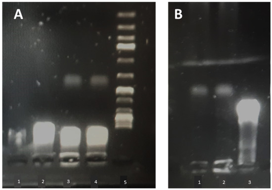 Liposome-plasmid complexes were mixed with DNA loading dye®, and 20 µL of each sample was placed in a 1% agarose gel stained with 8 µL of SYBR® safe DNA stain (Invitrogen, Carlsbad, CA, USA). A 1 kbp DNA ladder (Thermofisher, GeneRuler®, Waltham, MA, USA,) was run in parallel on each gel, and plasmid (pCMVkan-S) alone served as a control. A voltage of 80 V was applied for 30 min using Tris-Borate-EDTA (TBE) as a buffer. Plasmid migration was visualized by UV transillumination (Bio-Rad, ChemiDoc® XRS, Hercules, CA, USA).
