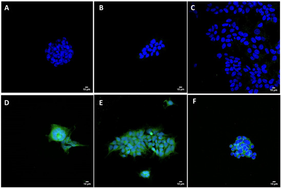 Intracellular SARS-CoV-2 S protein expression. HEK293 cells were transfected with pCMVkan-S alone or as nanoplexes. (A) = cells alone; (B) = only secondary Ab; (C) = pCMVkan-S alone; (D) = N/P 0.25:1 DOTAP4/pCMVkan-S; (E) = N/P 1:1 DOTAP4/pCMVkan-S; (F) = lipofectamine/pCMVkan-S lipoplexes. Green = S protein, Blue = nucleus. Images were obtained by confocal laser scanning microscopy, ×40 magnification, bar = 10 µm.