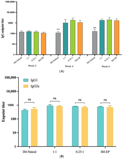 (A) Endpoint titers of SARS-CoV-2 spike-specific total IgG analyzed at weeks 2, 4, and 6 in mice immunized intramuscularly with naked pCMVkan-S (IM-naked), pCMVkan-S formulated with DOTAP4 at N/P ratios of 1:1 and 0.25:1, and by using electroporation device (IM-EP), (B) IgG subclass analysis; IgG1 and IgG2a in immunized mice sera collected on week 6. Data presented as mean ± SD of the endpoint titers in each vaccination group (n = 5). ** indicate p < 0.01 when compared to other groups. ns: not statistically significant.