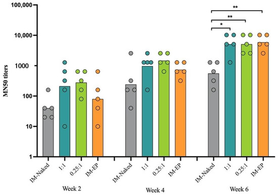 Immunized mouse sera were subjected to analysis of neutralization activity against wild-type SARS-CoV-2 virus. Consistent with IgG results, neutralizing antibody levels were detected in most of the immunized animals at 2 weeks after the first doses (Figure 10). The titers gradually increased following the second immunization (week 4). At this time-point, the MN50 geometric mean titers (GMTs) in the IM-naked group were at least 2.6-fold lower than in other groups; the GMTs for IM-naked, N/P 1:1, N/P 0.25:1, and IM-EP groups were 243, 970, 1280, and 640, respectively. At week 6, the titers in the IM-naked group were significantly lower than in other groups. Importantly, at this time-point, both groups of DOTAP4/pCMVkan-S showed comparable levels of GMTs, with the IM-EP group used as a positive control group. The GMTs at week 6 for IM-naked, N/P 1:1, N/P 0.25:1, and IM-EP groups were 557, 5120, 5120, and 5881, respectively.