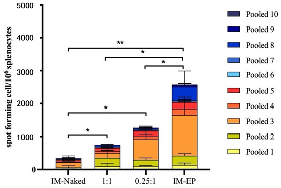 We measured IFN-γ secreting cells from splenocytes of immunized mice using ELISpot assay at 2 weeks after the third immunization. In all groups, mouse splenocytes secreted IFN-γ when stimulated with spike peptide pools (Figure 11). The highest magnitude of the IFN-γ ELISpot response was observed in the IM-EP group (mean = 2572 SFC/106 splenocytes), which showed significantly higher SFC than other groups. Interestingly, both DOTAP4/pCMVkan-S groups showed significantly higher magnitudes of response than the naked pCMVkan-S group (IM-naked group). An N/P ratio of 0.25:1 tended to induce higher responses than those of N/P 1:1 (1.7-fold increase), however, at p > 0.05. The average SFCs for IM-naked, N/P 1:1, and N/P 0.25:1 groups were 330, 738, and 1239 SFC/106 splenocytes, respectively. Of note, the IM-naked group showed the lowest response when compared to other groups. Cytokine secretion in culture supernatant after stimulation of mouse splenocytes with spike peptide pools revealed that IL-2, a marker of Th1 response, was the highest induced by the IM-EP group followed by the N/P 0.25:1 group. More importantly, IL-4, a Th2 marker, was not detected in any group (Supplementary Figure S3).