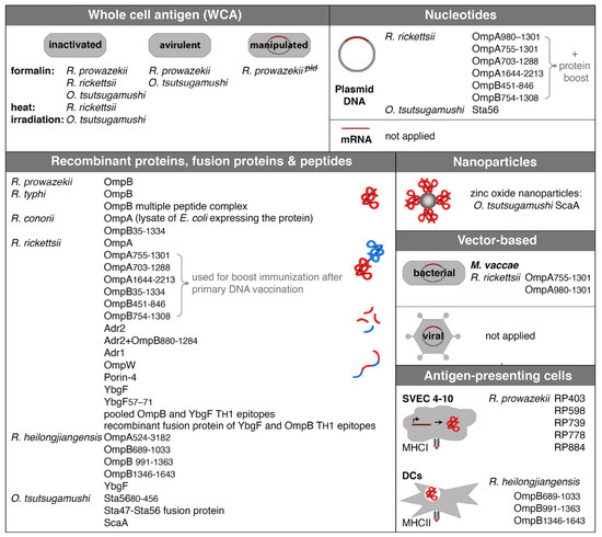 A conventional way of immunization is the application of recombinant proteins, and most approaches of vaccination against rickettsial infections in experimental animal models used either proteins, protein fragments, fusion proteins, or peptides.