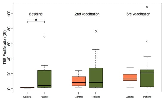 Boxplots showing the median and distribution of lymphocyte proliferation as detected by thymidine incorporation assay (the stimulation indices are given) at three different time points for healthy controls (orange) and patients (green) after stimulation with TBE antigen. Asterisk marks significant p-value (p = 0.0019).
