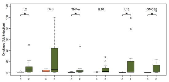 Boxplots showing the median and distribution of cytokines as detected by Luminex assay at baseline before vaccination for healthy controls (orange) and patients (green) after stimulation with TBE antigen. Asterisk marks significant p-value (IL2: p = 0.03; TNF-alpha: p = 0.03; IL13: p < 0.001; GM-CSF: p = 0.01).