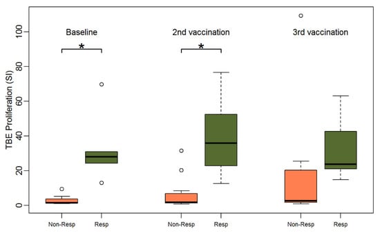Boxplots showing the median and distribution of lymphocyte proliferation as detected by thymidine incorporation assay (the stimulation indices are given) at three different time points for humoral non-responders (orange) and responders (green) after stimulation with TBE antigen (response was defined as NT ≥ 10 and at least two-fold increase in titer after two vaccinations). Asterisk marks significant p-value (baseline: p < 0.001; 2nd vaccination: p = 0.0019).