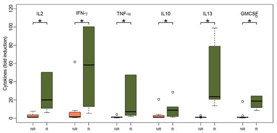 Boxplots showing the median and distribution of cytokines as detected by Luminex assay at baseline before vaccination for humoral non-responders (orange) and responders (green) after stimulation with TBE antigen (response was defined as NT ≥ 10 and at least two-fold increase in titer after two vaccinations). Asterisk marks significant p-value (IL2: p < 0.001; IFN-gamma: p = 0.003; TNF-alpha: p = 0.002; IL10: p = 0.04; IL13: p < 0.001; GM-CSF: p = 0.001).