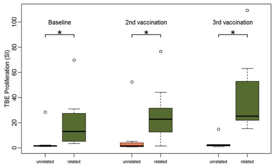 Boxplots showing the median and distribution of lymphocyte proliferation as detected by thymidine incorporation assay (the stimulation indices are given) at three different time points for patients with unrelated (orange) and related donors (green) after stimulation with TBE antigen. Asterisk marks significant p-value (baseline: p = 0.004; 2nd vaccination: p = 0.015; 3rd vaccination: p = 0.002).