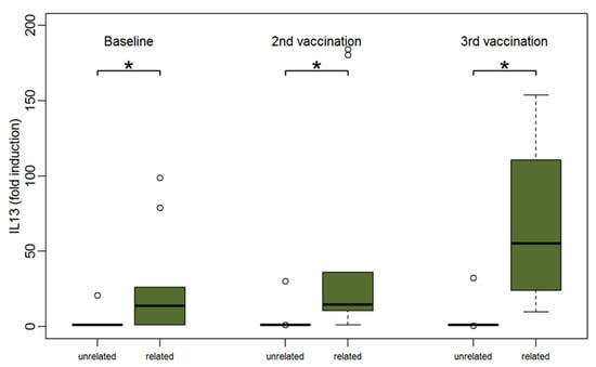Although PBMCs of patients with related donors produced higher amounts of cytokines at baseline than PBMCs of patients with unrelated donors, this was not statistically significant except for IL-13 (median 13.6 for PBMCs of patients with related donors vs. 1 for PBMCs of patients with unrelated donors, p = 0.04). After two vaccinations the amount of most cytokines was significantly higher in the group of patients with related donors. IL-13 was the only cytokine with significantly stronger responses between patients with related compared to unrelated donors at all three time points (p < 0.05) (Figure 6).