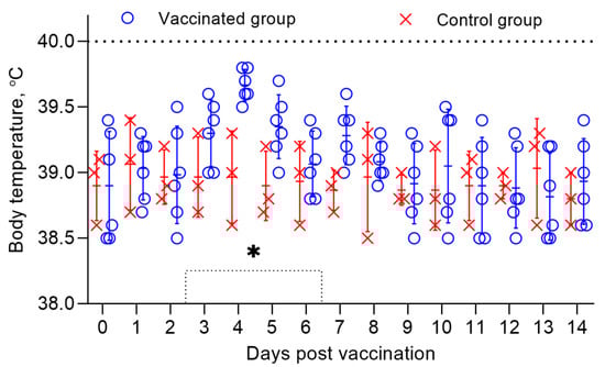 All immunized animals were subjected to a clinical study through regular observations and daily rectal temperature records in order to detect post-vaccination reactions. The formation of inflammatory edemas in the form of infiltrates at the injection site sized up to 1.0 cm in diameter and being self-eliminated within 3–6 days was considered to be a positive post-vaccination reaction.