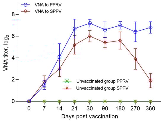 Protective titers of NA to SPPV (1.8 log2) developed in vaccinated sheep, one week earlier, as compared to the titers of NA to PPRV (4.1 log2), which were formed on the 14th day of dpv (Figure 2). Similar results were obtained in the study by Fakri et al. [,] where the authors observed an early humoral response (after 7 days) to SPPV post-vaccination of animals with a combined vaccine. However, only 90% of the vaccinated animals were protected from SPPV 21 dvp with this vaccine.