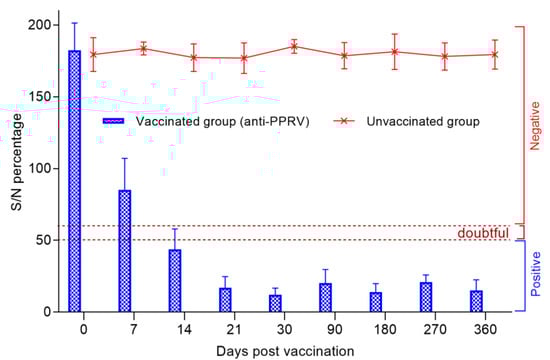 Before vaccination, sheep serum samples were tested for the presence of antibodies, which were found to be negative, as all the samples had an S/N ratio >150%. After being vaccinated for only 7 days, the percentage of S/N dropped sharply to 85%, with 45% of the animals being protected, the remaining 25% of the animals had a titer of produced antibodies above the permissible limit of the S/N value (˃60%), while in 30% of the animals, the c-ELISA results were questionable (50–60%). However, at the 14th dpv, 95% of the vaccinated sheep were protected from PPRV, judging by the antibody titers, since the S/N values were 50%. The average S/N value was 17% on the 21st dpv, and all animals were 100% protected from PPRV. The lowest S/N % value (12%) was recorded on the 30th dpv. The antibodies produced by day 30 post-vaccination persisted until the end of the experiment (360 days), with slight fluctuations (p ˃ 0.05) (Figure 3).