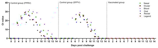 Blood and swab samples were collected from the animals following vaccination and challenge, and RT-qPCR was carried out to detect viral nucleic acids in blood and various body excretions. None of the vaccinated animals showed the presence of PPRV and SPPV in blood samples and nasal, ocular, oral, and rectal swabs collected at regular intervals after vaccination and challenge. However, after challenge, the PPRV and SPPV antigen was detected in the blood and in all types of swabs taken from intact animals (Figure 4). Similar results were obtained by S. S. Chaudhary et al. (2009), as well as by M. Hosamni et al. (2006), when using a divalent vaccine against PPRV and SPPV/ GPV [,].