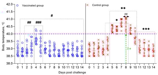 Dynamics of changes in the body temperature of sheep vaccinated and control groups post-challenge with the virulent strain A of the SPPV. Rectal temperatures of ten animals in each group are shown in the graph. The dotted line in graph shows the upper limit of the normal body temperature. (#) Within 14 days, in the vaccinated animals, no clinical symptoms characteristic of SPPV were observed, with the exception of local reactions in three sheep. (##) Local reactions that appeared post challenge in vaccinated sheep existed for 2–3 days. (*) Starting on the 2nd dpc, unvaccinated sheep developed local reactions in the form of edema of a dense consistency. (**) From 5 to 12 days, the control animals developed clinical symptoms, such as watery and mucopurulent discharge from the eyes and nose, papules, hyperemia in the oral cavity, decreased appetite, and depression. (3 e) On day 9, 3 sheep from the control group were humanely euthanized post-challenge due to the deterioration of their general condition. (pp) The peak of pyrexia in unvaccinated animals was noted on the 7th dpc. (***) During the specified time intervals (from 10 to 14 days), 7 out of 10 infected animals remained alive and began to recover.