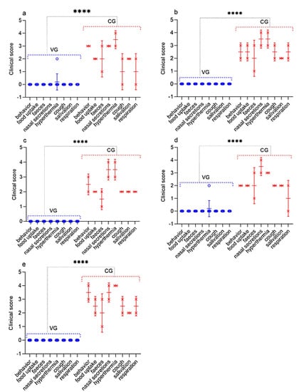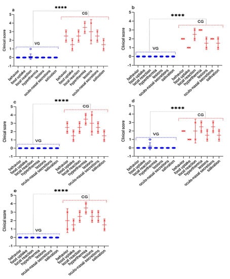 Assessment of the clinical signs in vaccinated and control sheep after infection with virulent SPPV. (a) Challenge 30 dpv. (b) Challenge 90 dpv. (c) Challenge 180 dpv. (d) Challenge 270 dpv. (e) Challenge 360 dpv. VG vaccinated group infected with virulent SPPV (n = 10). CG control group infected with virulent SPPV (n = 2). Data are means ± standard errors; **** p < 0.0001.