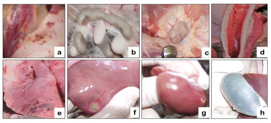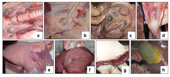 Internal examination of forcibly euthanized sheep post-challenge with the virulent strain A of the SPPV. (a) Spotty hemorrhages in the subcutaneous tissue and musculature. (b) Enlarged mesenteric lymph nodes. (c) Enlargement of the popliteal lymph nodes. (d) Subcapsular lesions in the tracheal mucosa. (e) Spotty hemorrhages, and lesions in the lungs. (f) Serous lesion in the liver. (g) Subcapsular lesion in the kidney. (h) The gallbladder is full.