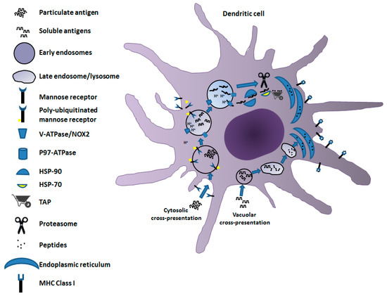 Mechanisms of cross-presentation. Both vacuolar (bottom flow) and cytosolic (upper flow) pathways are depicted. In the vacuolar cross-presentation pathway, after internalization by endo/pinocytosis, the antigen remains in intracellular compartments. It is degraded by the activity of cathepsin S, and the resulting peptides are translocated to ER to be loaded on MHC Class I molecules. In the cytosolic pathway, the antigen, more often in a particulate form, is internalized by endocytosis, thereby undergoing dissociation/denaturation in a mildly acidic pH regulated by the v-ATPase/NOX2 interaction. Denatured antigens are then transferred to cytosol through channels formed by p97 ATPase recruited to endosomes upon poly-ubiquitination of MR. Exported antigens bind chaperone Hsp90, and then are forwarded to proteasome degradation after interaction with Hsp70. Finally, peptides are translocated by TAP into ER, where they associate with the MHC Class I complex.