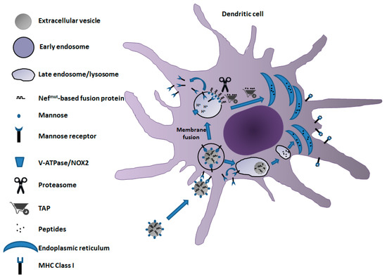 On the basis of these consolidated data of literature, a model for the mechanism of the cross-presentation of antigens uploaded in Nefmut-engineered EVs can be envisioned (Figure 2). After release from muscle cells, Nefmut-engineered EVs, by virtue of their expected high mannose content in membrane, bind an MR of immature DCs. Subsequent EV cell internalization can be followed by degradation into late endosomes/lysosomes, ultimately leading to the delivery of peptides to ER for complexing with MHC Class I at the completion of the vacuolar cross-presentation pathway. Alternatively, the endosome-internalized EV can undergo fusion with membranes of endosomes, similar to what was described for several viruses [71,72]. In this way, Nefmut-based fusion products are exposed to cytoplasm, hence becoming vulnerable to the proteasome degradative activity. Resulting peptides can be then translocated to ER by TAP for their complexing with MHC Class I molecules to initiate cross-priming events. Although this mechanism may be conceivable considering the N-terminal binding with the EV membrane of Nefmut-related products, experimental confirmations are still needed.