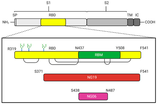 Schematic diagram of the antigens employed as vaccine candidates against SARS-CoV-2, for heterologous expression in the E. coli-based platform. SP: signal peptide, S1: Subunit 1, S2: Subunit 2, TM: Transmembrane domain, IC: Intracellular domain, RBD: Receptor binding site, RBM: receptor binding motif, NG19: Non-glycosylated 19 kDa, and NG06: Non-glycosylated 6 kDa. The three glycosylation sites on the RBD are shown in the amino terminal region. The brackets joining regions in RDB correspond to previously described disulfide bridges.