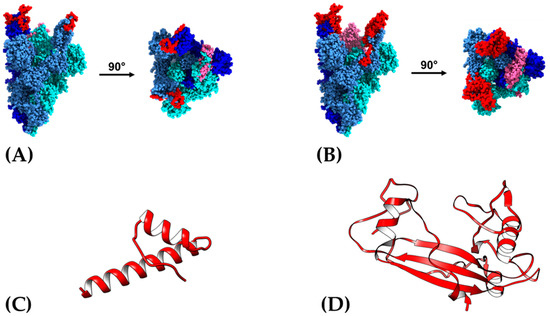After structural modeling, the proteins were validated considering the Z value global quality graphs of the models obtained, as well as Ramachandran graphs. The Z values of both models were −3.99 for NG06 and −6.31 for NG19, which are within the calculated values for proteins resolved by NMR; also, local quality models do not exceed thresholds using window size values of 40 amino acids (Figure S2). Finally, in Ramachandran plots for NG06 protein, we observed 97.8% of the residues within the favored regions, 2.2% in additional permitted regions, while NG19 contains 90.6% amino acid in more favored regions, 8.1% in additional favored regions, and 1.3% in generously permitted regions. Both models presented 0% amino acids in non-favored regions, which indicates the good quality of the models obtained (Figure S3). The selected regions are shown within the Spike structure as regions highlighted in red, as part of each monomer in open (red) or pink (closed) conformation and as part of RBD (Figure 2A,B). Additionally, the final visualization of the de novo predicted models are shown in the panels (Figure 2C,D).